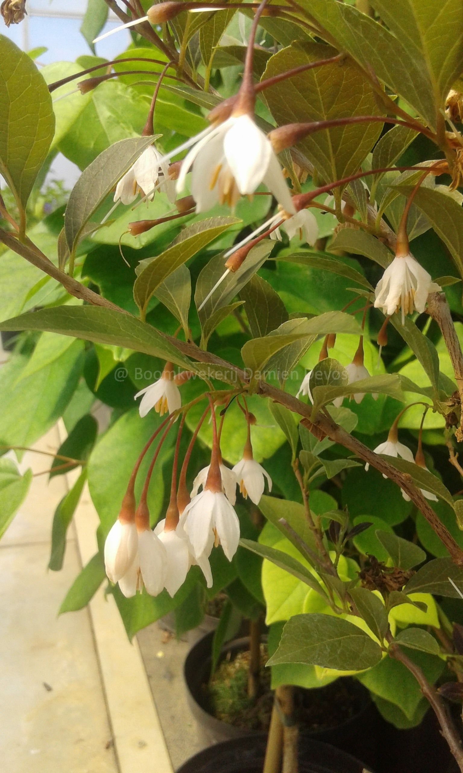In het voorjaar (mei-juni) verschijnt er op deze Styrax een prachtig contrast van de witte bloempjes tegenover de paarsachtige bladeren.