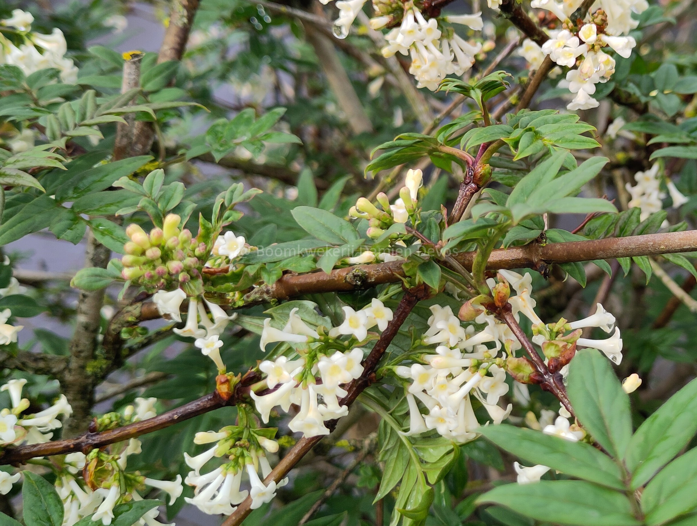 Struik met geveerde, donkergroene blaadjes die een prachtig contrast geven met de witte (heel licht roze getint), zachtgeurende bloempjes die in maart - april verschijnen.