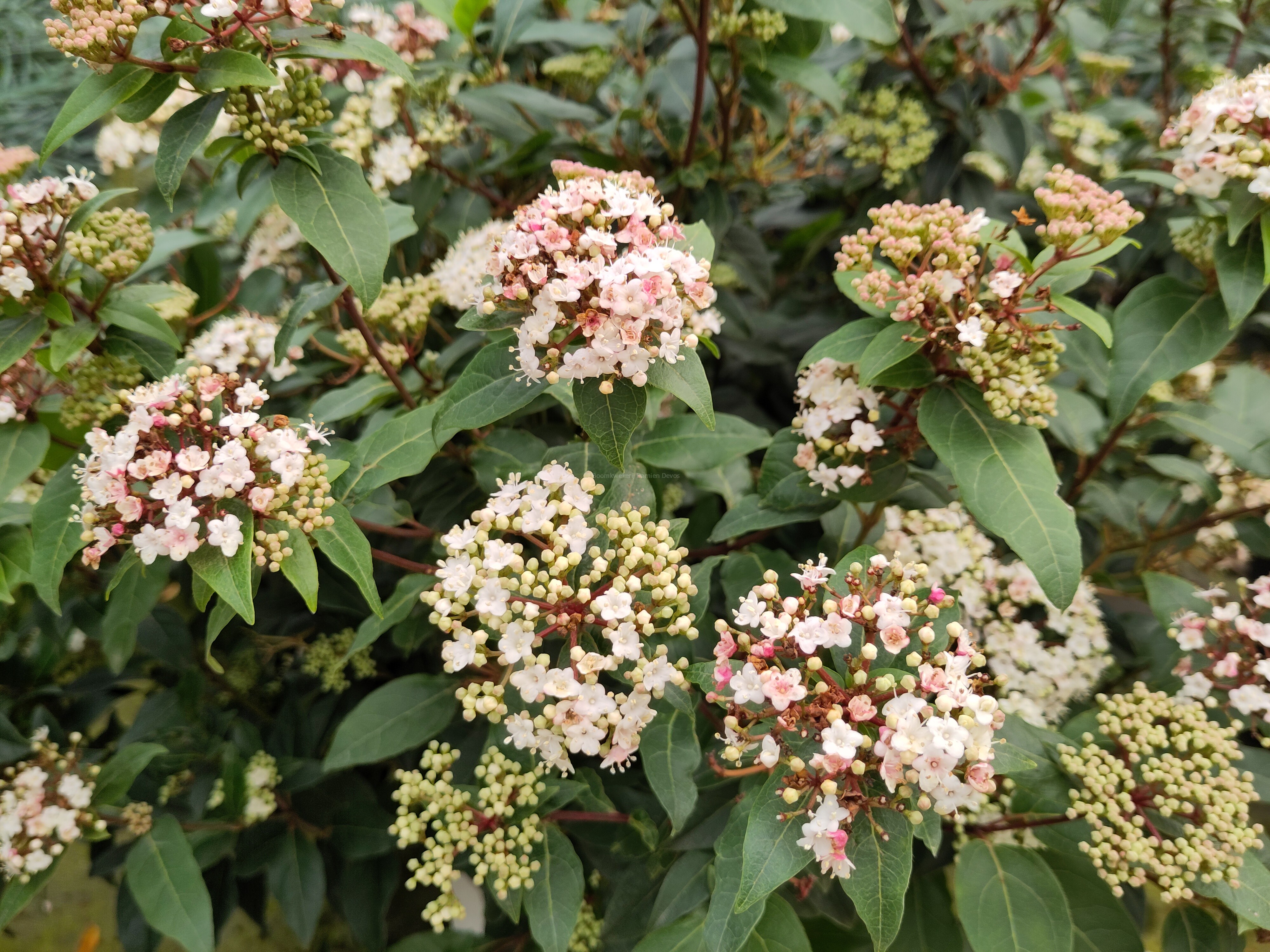 Deze prachtige, groenblijvende struik bloeit superlang! Eerst verschijnen er roze knoppen waaruit dan witte - roze bloempjes komen! Een echte aanrader!